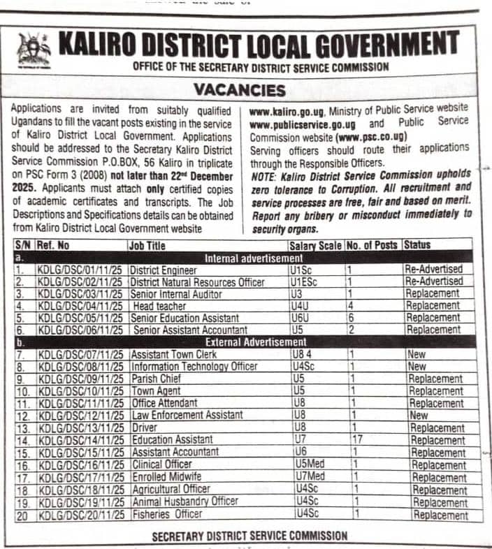 Applications are invited from suitably qualified Ugandans to fill the vacant posts existing in the service of Kaliro District Local Government. Applications should be addressed to the Secretary Kaliro District Service Commission P.O.BOX, 56 Kaliro in triplicate on PSC Form 3 (2008) not later than 22nd December 2025. Applicants must attach certified copies of academic documents. The Job Descriptions and Specifications details can be obtained from Kaliro District Local Government website www.kaliro.go.ug, Ministry of Public Service website www. publicservice.go.ug and Public Service Commission website https://psc.go.ug Application forms are obtained from Public Service Commission Offices, Farmers House second floor Parliamentary Avenue Kampala or on Public Service Commission website.